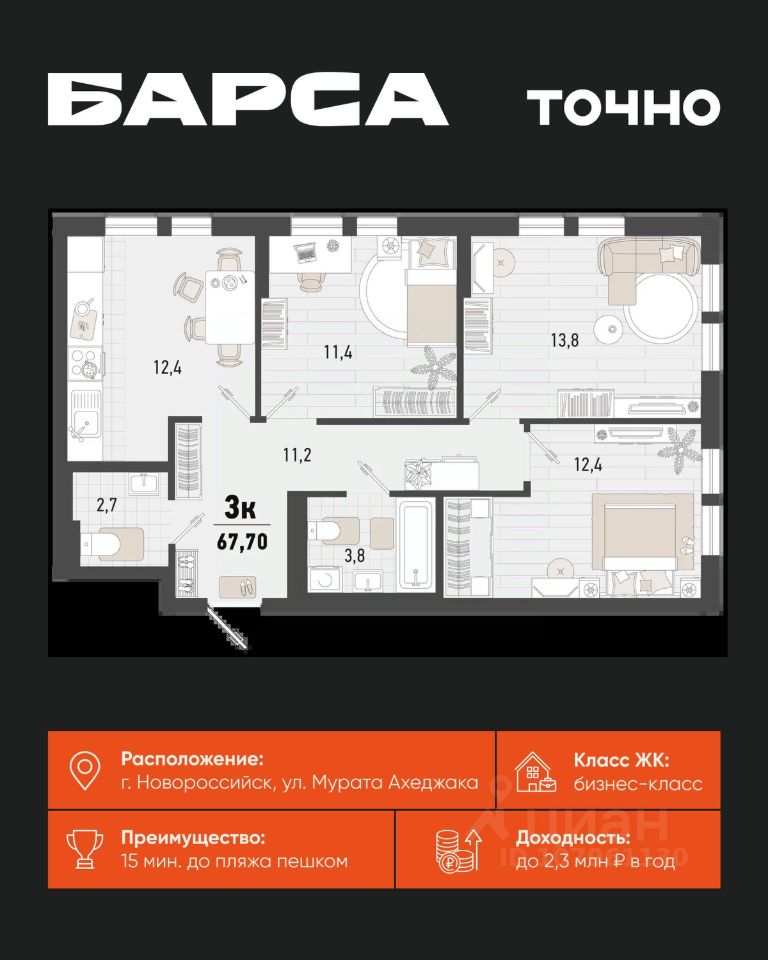 3-к, Барса ЖК, 1в