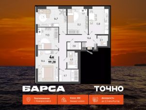 Продаётся 4-комнатная квартира в строящемся доме (Дом 3В), срок сдачи: II-кв. 2027, общей площадью 99.2 кв.м., на 1 этаже. Жилой комплекс ''Барса'' расположился в самом живописном Южном районе Новороссийска, всего в 15 минутах ходьбы от пляжа ''Алексино''. Море будет видно даже из окон невысоких этажей. Проект объединяет просторные квартиры с панорамными окнами, продуманные зоны отдыха и площадки для спорта, прогулочный бульвар, беседки и уникальные арт-объекты. В жилом комплексе запланированы детский сад на 380 мест и школа на 1 750 мест.Больше не нужно выбирать между жизнью на курорте и в мегаполисе. ''Барса'' — новый проект для безупречной жизни людей на побережье!