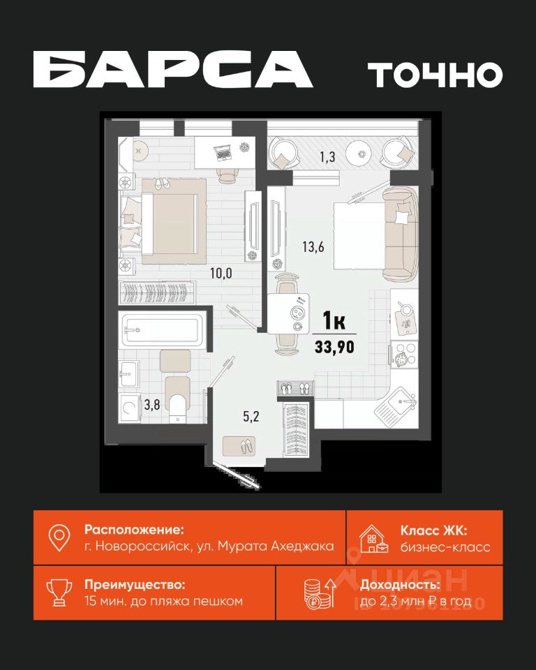 Уникальная 1-комнатная Квартира 14 площадью 57,86 кв.м. в ЖК ''Золотой Берег'' — 800 метров или 10 минут до моря, современный дизайн и все условия для комфортной жизни! Предлагаем вам идеальную квартиру в жилом комплексе ''Золотой Берег'' от компании ''СРЕДАстрой''. Это уникальное предложение сочетает в себе все, что нужно для удобной и комфортной жизни в одном из лучших районов города. Преимущества квартиры: • 800 метров или 10 минут до моря — наслаждайтесь свежим морским воздухом, ежедневным завораживающим видом на море, живописным закатом и это каждый день. • Ипотека от 3,5 % — доступные условия для приобретения квартиры/ жилья вашей мечты. • Рядом с домом: 2 детских сада, 4 школы — всё необходимое для развития и обучения ваших детей в шаговой доступности. • Детские площадки во дворе без машин — безопасная среда для игр и отдыха. • Выбор отделки: квартиры с качественной отделкой или качественная ПЧО/ без отделки, что позволит вам создать интерьер по своему вкусу. • Современный и красивый дизайн домов, подъездных холов — эстетика и стиль, продуманные до мелочей. Инфраструктура: • В шаговой доступности: гипермаркет Лента, магазины, кафе, аптеки, фитнес-центры — всё, что нужно для комфортной жизни. • Тип дома: монолитно-кирпичный, построенный по современным технологиям, 17/ 16 этажей с прилегающими торгово-офисными помещениями. • Паркинг: -1 этаж подземный отапливаемый паркинг с видеонаблюдением 24/7. Прямой доступ на лифте — удобно и безопасно.закрытая территория всего комплекса, нет посторонних людей. Описание квартиры: • Просторные комнаты с продуманной планировкой и панорамными окнами. • Возможность индивидуального дизайна интерьера или готовая качественная отделка. • Современные инженерные системы и высококачественные материалы. ЖК ''Золотой Берег'' — это сочетание высокого качества строительства, удобной инфраструктуры и прекрасного расположения. Здесь каждый найдет всё, что нужно для комфортной и счастливой жизни.