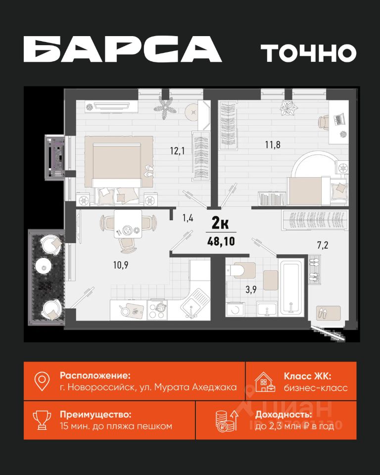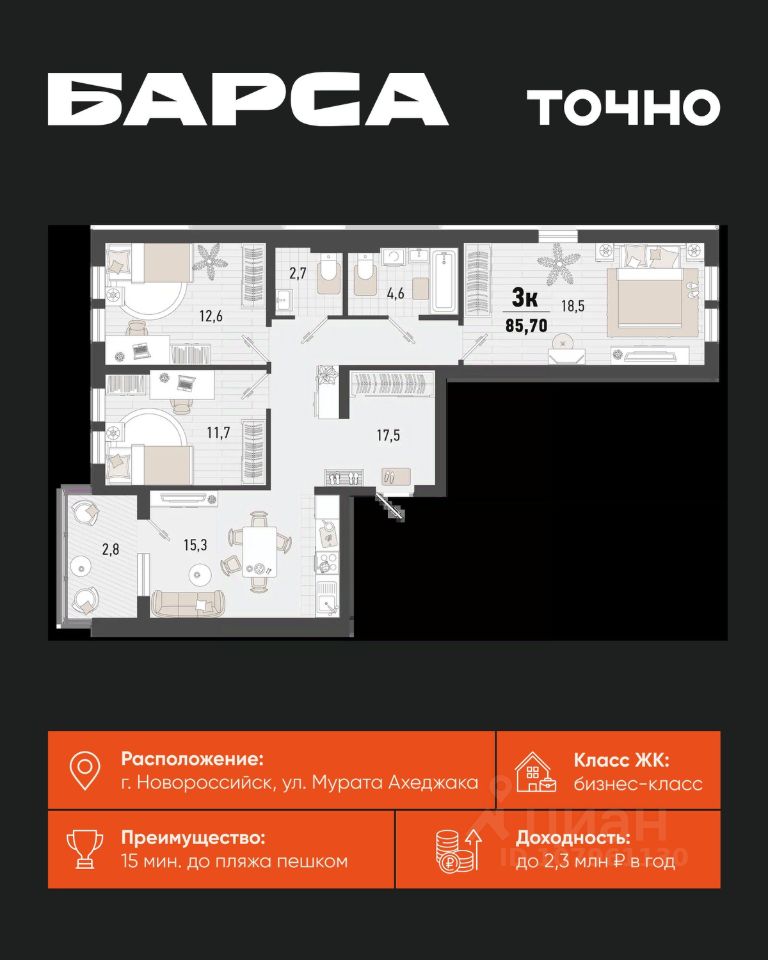 Жилой комплекс ''Барса'' расположился в самом живописном Южном районе Новороссийска, всего в 15 минутах ходьбы от пляжа ''Алексино''. Море будет видно даже из окон невысоких этажей. Проект объединяет просторные квартиры с панорамными окнами, продуманные зоны отдыха и площадки для спорта, прогулочный бульвар, беседки и уникальные арт-объекты. В жилом комплексе запланированы детский сад на 380 мест и школа на 1 750 мест. Больше не нужно выбирать между жизнью на курорте и в мегаполисе. ''Барса'' — новый проект для безупречной жизни людей на побережье!