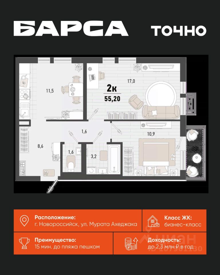 55 м² · Этаж 17 из 24