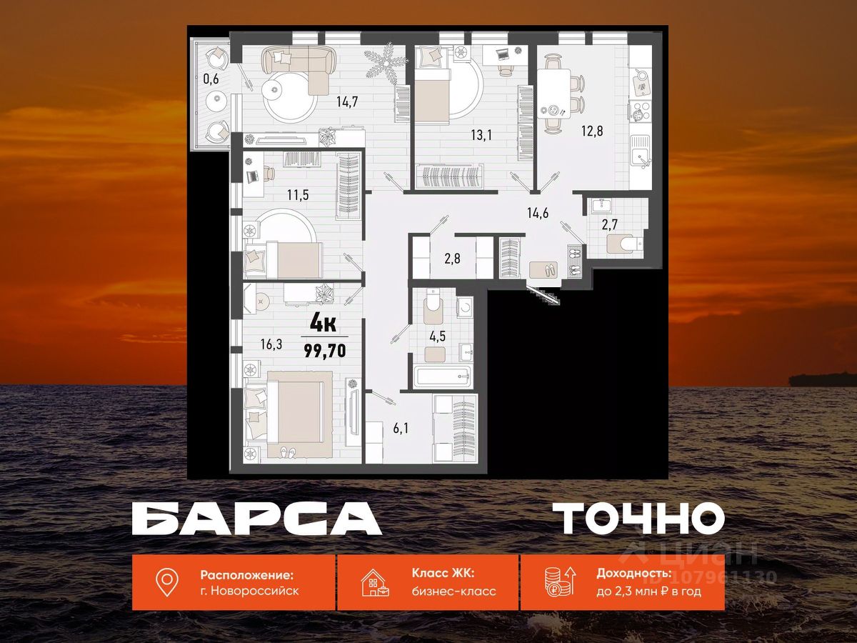 Продаётся 2-комнатная квартира в строящемся доме (Дом 4В), срок сдачи: II-кв. 2027, общей площадью 54.4 кв.м., на 4 этаже. Жилой комплекс ''Барса'' расположился в самом живописном Южном районе Новороссийска, всего в 15 минутах ходьбы от пляжа ''Алексино''. Море будет видно даже из окон невысоких этажей. Проект объединяет просторные квартиры с панорамными окнами, продуманные зоны отдыха и площадки для спорта, прогулочный бульвар, беседки и уникальные арт-объекты. В жилом комплексе запланированы детский сад на 380 мест и школа на 1 750 мест. Больше не нужно выбирать между жизнью на курорте и в мегаполисе. ''Барса'' — новый проект для безупречной жизни людей на побережье!
