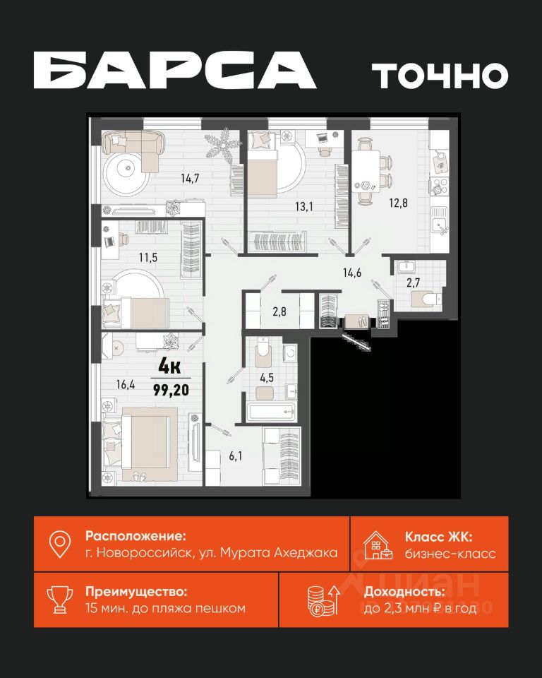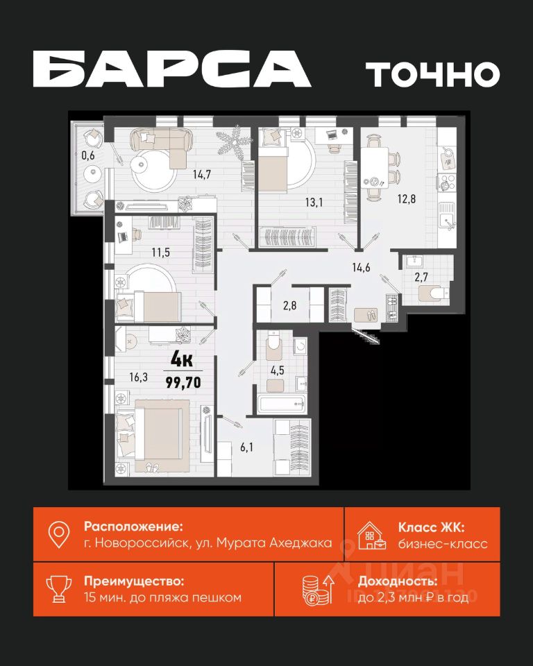 Жилой комплекс ''Барса'' расположился в самом живописном Южном районе Новороссийска, всего в 15 минутах ходьбы от пляжа ''Алексино''. Море будет видно даже из окон невысоких этажей. Проект объединяет просторные квартиры с панорамными окнами, продуманные зоны отдыха и площадки для спорта, прогулочный бульвар, беседки и уникальные арт-объекты. В жилом комплексе запланированы детский сад на 380 мест и школа на 1 750 мест. Больше не нужно выбирать между жизнью на курорте и в мегаполисе. ''Барса'' — новый проект для безупречной жизни людей на побережье!