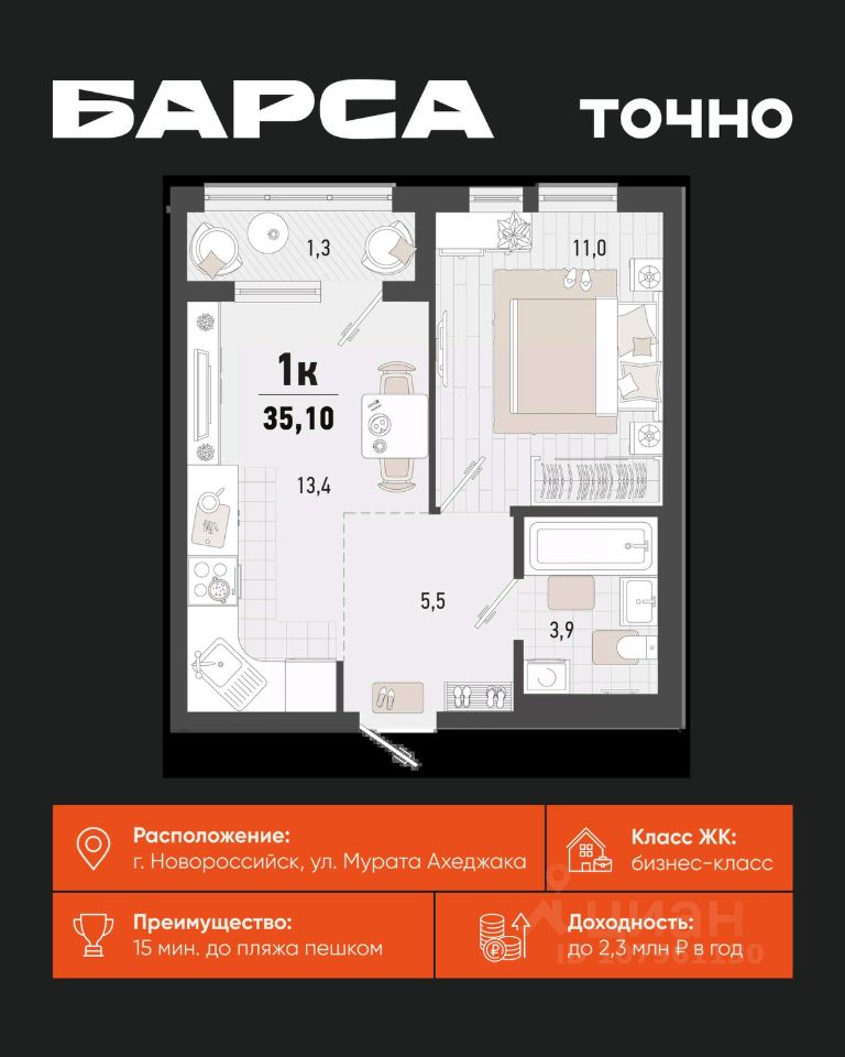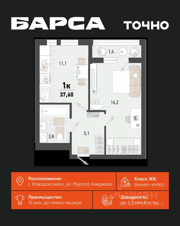 1-к, Барса ЖК, 1в