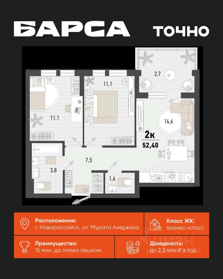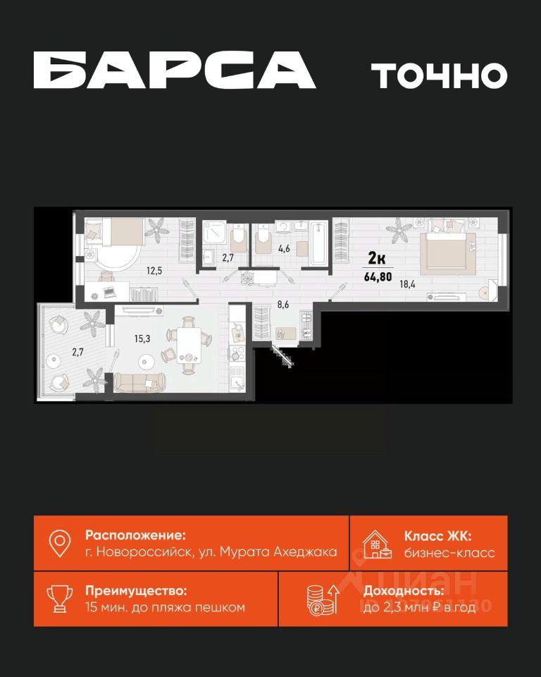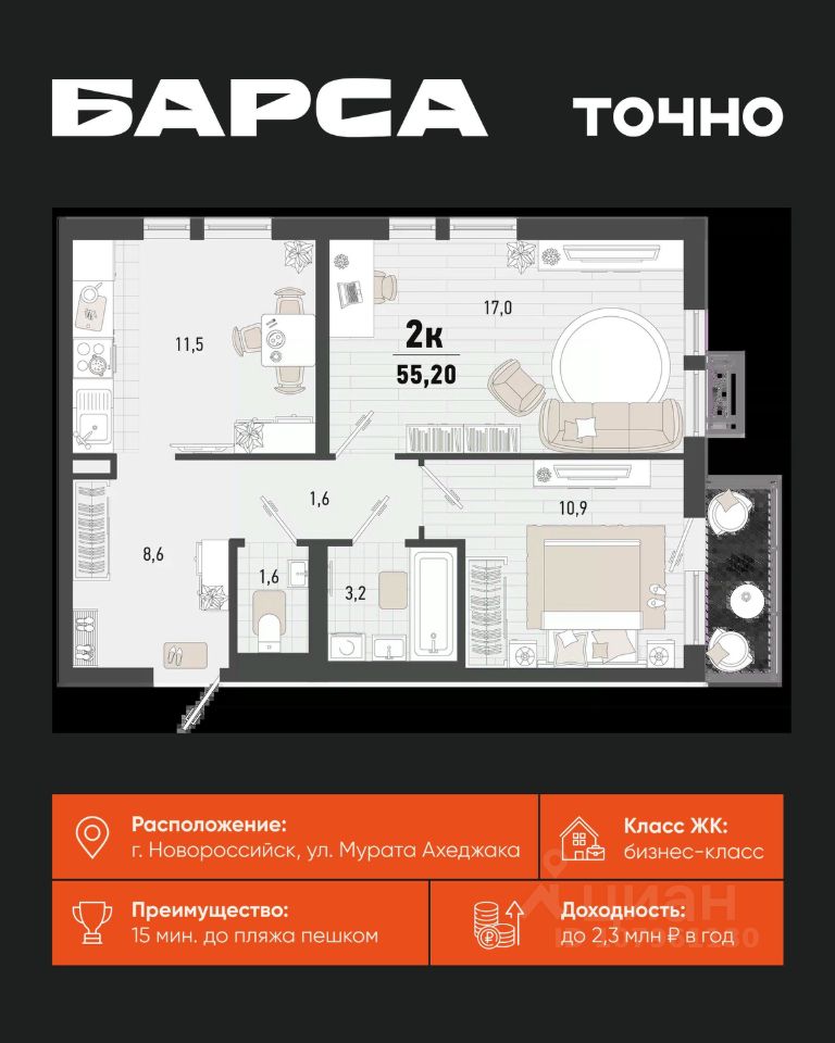 Жилой комплекс ''Барса'' расположился в самом живописном Южном районе Новороссийска, всего в 15 минутах ходьбы от пляжа ''Алексино''. Море будет видно даже из окон невысоких этажей. Проект объединяет просторные квартиры с панорамными окнами, продуманные зоны отдыха и площадки для спорта, прогулочный бульвар, беседки и уникальные арт-объекты. В жилом комплексе запланированы детский сад на 380 мест и школа на 1 750 мест. Больше не нужно выбирать между жизнью на курорте и в мегаполисе. ''Барса'' — новый проект для безупречной жизни людей на побережье!