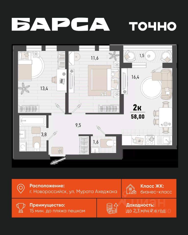 58 м² · Этаж 14 из 15