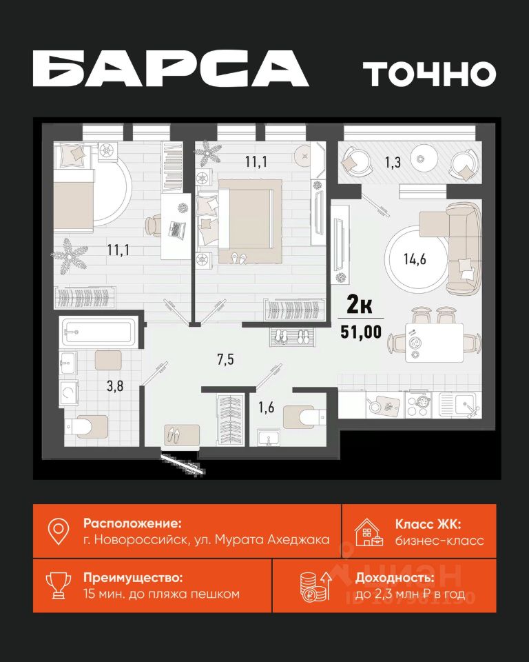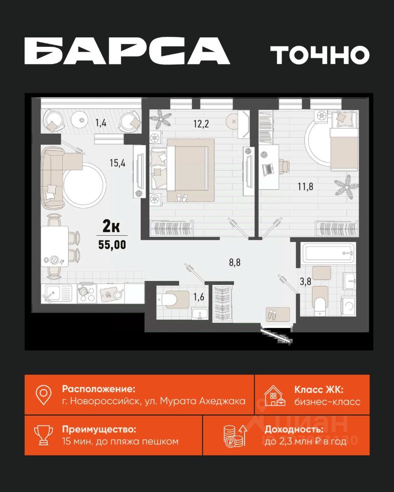 55 м² · Этаж 14 из 15