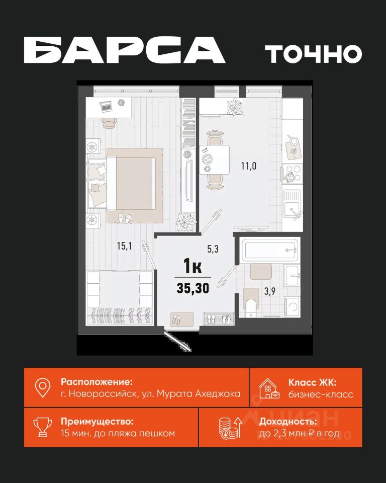 Уникальная 1-комнатная Квартира 94 площадью 42,93 кв.м. в ЖК ''Золотой Берег'' — 800 метров или 10 минут до моря, современный дизайн и все условия для комфортной жизни! Предлагаем вам идеальную квартиру в жилом комплексе ''Золотой Берег'' от компании ''СРЕДАстрой''. Это уникальное предложение сочетает в себе все, что нужно для удобной и комфортной жизни в одном из лучших районов города. Преимущества квартиры: • 800 метров или 10 минут до моря — наслаждайтесь свежим морским воздухом, ежедневным завораживающим видом на море, живописным закатом и это каждый день. • Ипотека от 3,5 % — доступные условия для приобретения квартиры/ жилья вашей мечты. • Рядом с домом: 2 детских сада, 4 школы — всё необходимое для развития и обучения ваших детей в шаговой доступности. • Детские площадки во дворе без машин — безопасная среда для игр и отдыха. • Выбор отделки: квартиры с качественной отделкой или качественная ПЧО/ без отделки, что позволит вам создать интерьер по своему вкусу. • Современный и красивый дизайн домов, подъездных холов — эстетика и стиль, продуманные до мелочей. Инфраструктура: • В шаговой доступности: гипермаркет Лента, магазины, кафе, аптеки, фитнес-центры — всё, что нужно для комфортной жизни. • Тип дома: монолитно-кирпичный, построенный по современным технологиям, 17/ 16 этажей с прилегающими торгово-офисными помещениями. • Паркинг: -1 этаж подземный отапливаемый паркинг с видеонаблюдением 24/7. Прямой доступ на лифте — удобно и безопасно.закрытая территория всего комплекса, нет посторонних людей. Описание квартиры: • Просторные комнаты с продуманной планировкой и панорамными окнами. • Возможность индивидуального дизайна интерьера или готовая качественная отделка. • Современные инженерные системы и высококачественные материалы. ЖК ''Золотой Берег'' — это сочетание высокого качества строительства, удобной инфраструктуры и прекрасного расположения. Здесь каждый найдет всё, что нужно для комфортной и счастливой жизни.