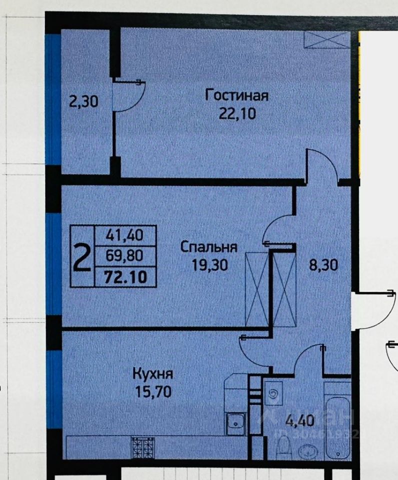 Основные характеристики: Общая площадь 72,1 кв.м Большая кухня-гостиная 15,7 кв.м Комнаты 22,1 и 19,3 кв.м Совмещенный санузел 4,4 кв.м Прихожая 8,3 кв.м Застекленная лоджия 4,6 кв.м