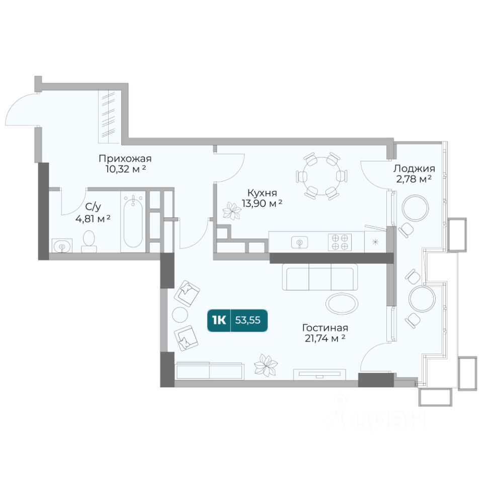 Общая площадь53,55 м2