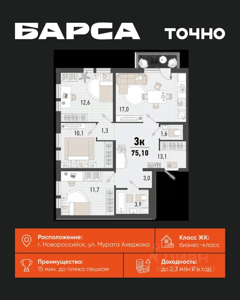 продам 3-к, Барса ЖК, 1в15 108 618 ₽
