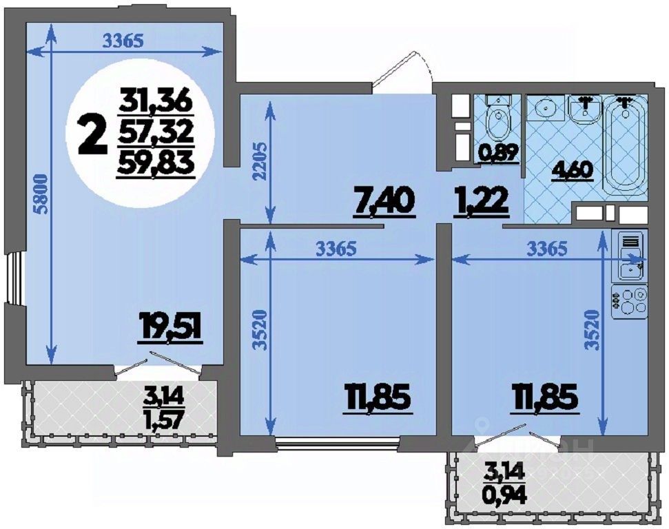 Общая площадь59,83 м2
