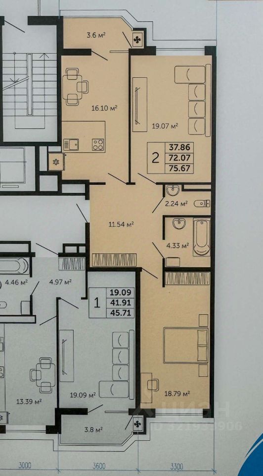 Планировка: центр притяжения - кухня-гостиная с удобным зонированием (16,10) остекленный балкон с расширенным витражом (3,6) ванная (4,33) и сан узел (2,24) разделены лаконичная спальня с изысканными световыми приборами и местами хранения (19,07) уютная детская комната (18,79) вместительная гардеробная (4) свободный холл (7,54)