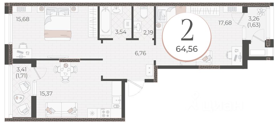 Общая площадь64,56 м2