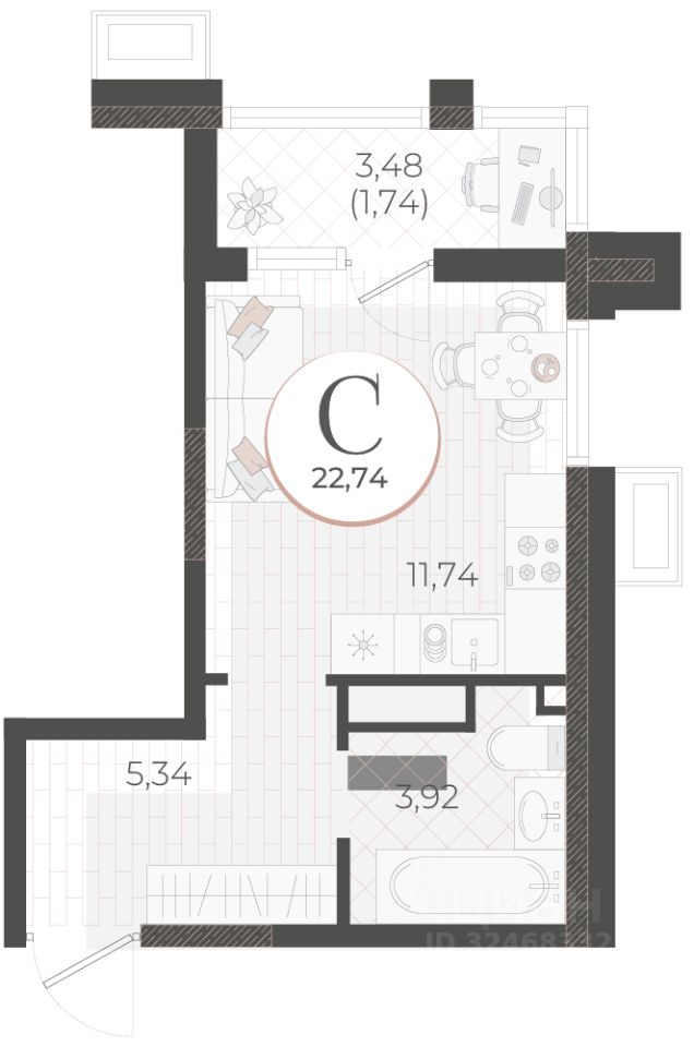 Общая площадь22,74 м2