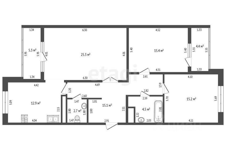 Площадь: 101 м² с 2я балкона (5,3 м² и 4,4 м²) Кухня: 13 м² Гостиная: 25 м² с выходом на балкон Спальни: 2 по 15 м² (одна с балконом) Санузлы: 2 Прихожая: С местом под гардеробную