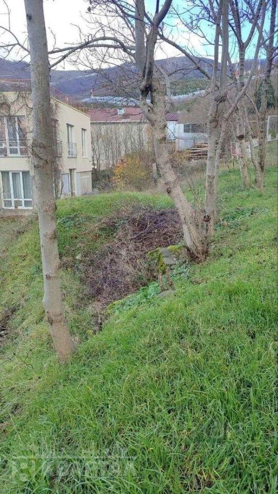 Есть небольшой уклон, очищен частично от деревьев.