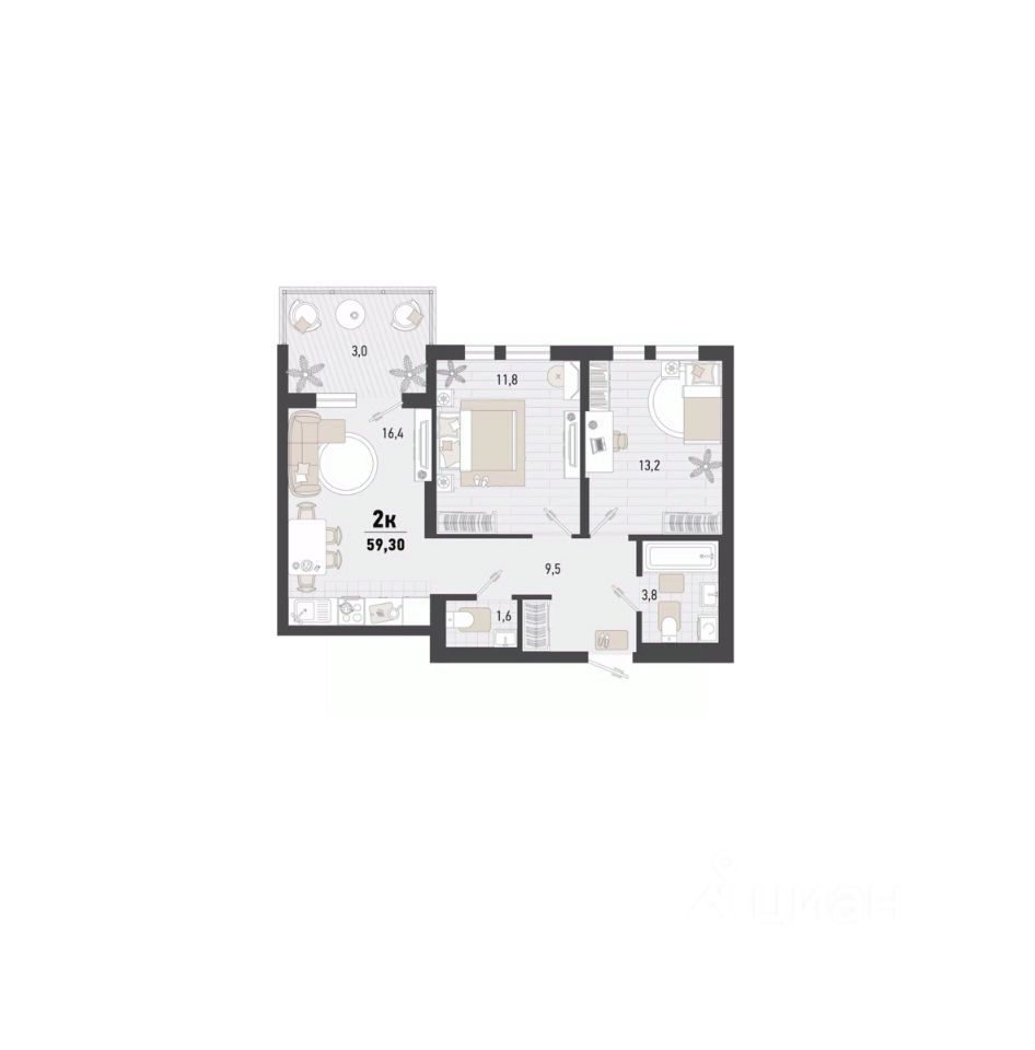 Общая площадь59,3 м2