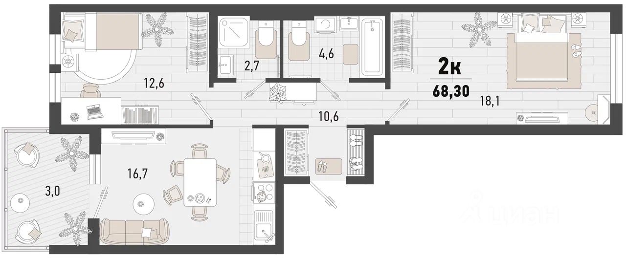 Продаётся 2-комнатная квартира в строящемся доме (Дом 3В), срок сдачи: II-кв. 2027, общей площадью 68.3 кв.м., на 2 этаже. Жилой комплекс ''Барса'' расположился в самом живописном Южном районе Новороссийска, всего в 15 минутах ходьбы от пляжа ''Алексино''. Море будет видно даже из окон невысоких этажей. Проект объединяет просторные квартиры с панорамными окнами, продуманные зоны отдыха и площадки для спорта, прогулочный бульвар, беседки и уникальные арт-объекты. В жилом комплексе запланированы детский сад на 380 мест и школа на 1 750 мест.