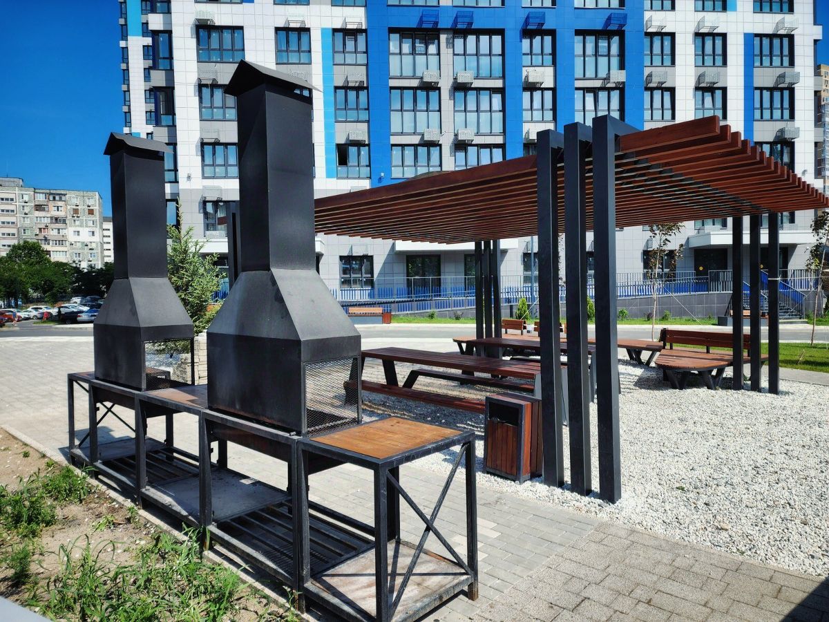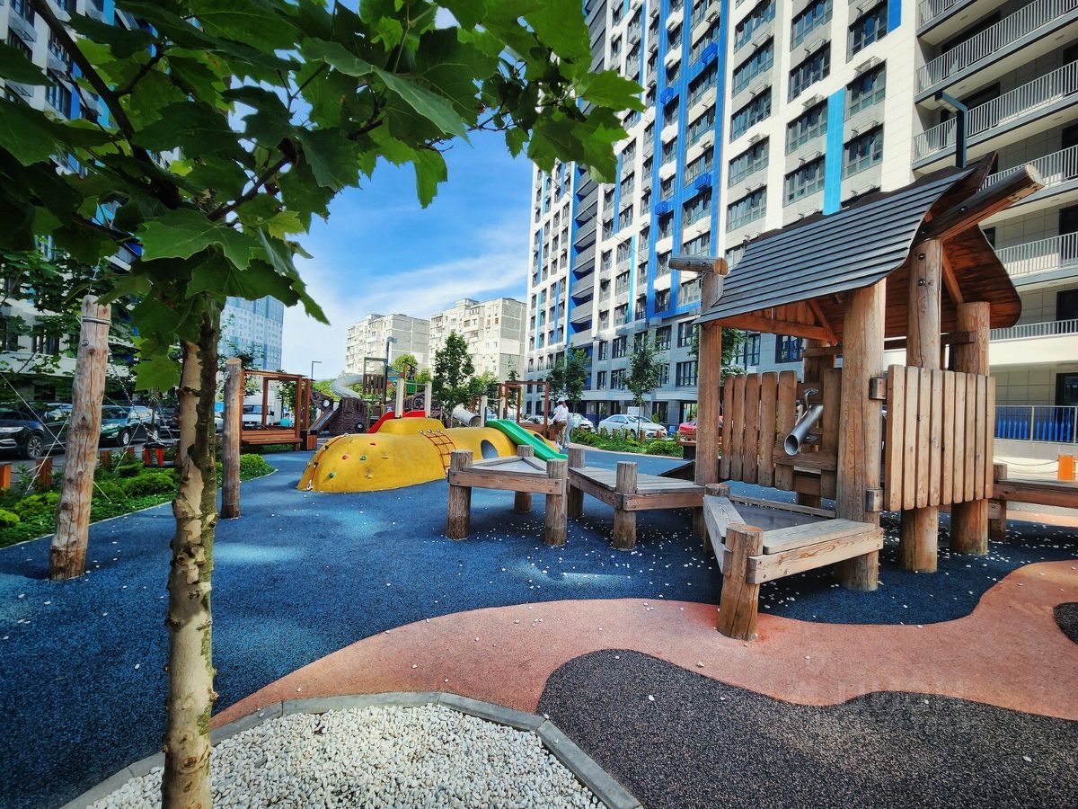 Детская площадка для самых маленьких. Зона отдыха для взрослых с барбекю. Спортивная площадка с турниками и тренажерами. Ухоженное озеленение. Паркинг: Во дворе и многоуровневая крытая парковка (возможность аренды).