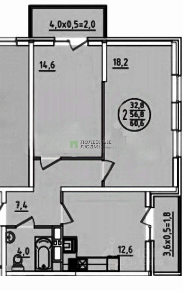 Цифры и планировка: Общая площадь 60,6 м² (с учетом лоджий). Две раздельные комнаты (18,2 и 14,6 м²) кухня 12,6 м².